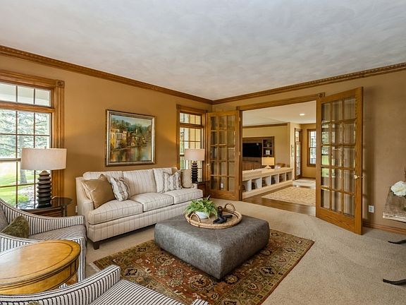The lower level is a versatile space, including a large rec room with a built-in bar area, full bath, exercise room, and ample storage.