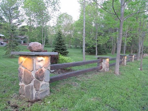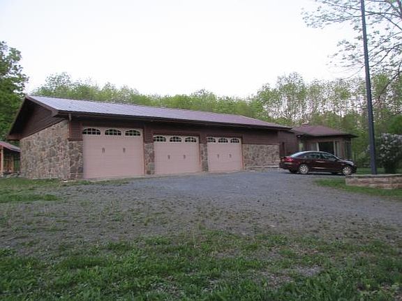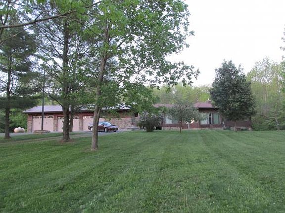 Park like setting with mature trees, lawn & gardens with custom lighted fence of stone and wood. Well built home with a custom open floor plan with a large eat-in kitchen, formal dining & sunken living room with stone fireplace & wood stove insert. Master suite has large bedroom with private bath with jetted tub & separate shower. Two additional bedrooms & full bath on main level as well as a laundry room. Lower level has family room, additional bedroom & recently renovated full bath. Lots of room for storage & expansion on lower level. Oversized 32X56 3 car garage. Stone patio with gardens.