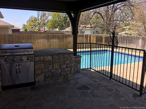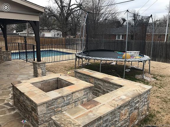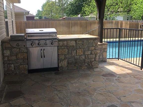Nice outdoor living area with pool, outdoor kitchen and Stone firepit with stone bench around. Also indoors with nice stone fireplace to ceiling and stone around bar area.