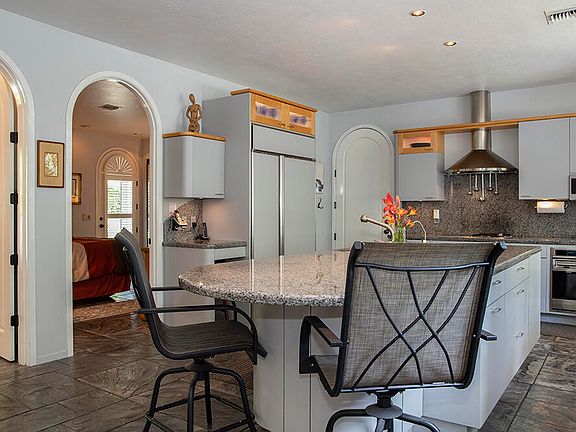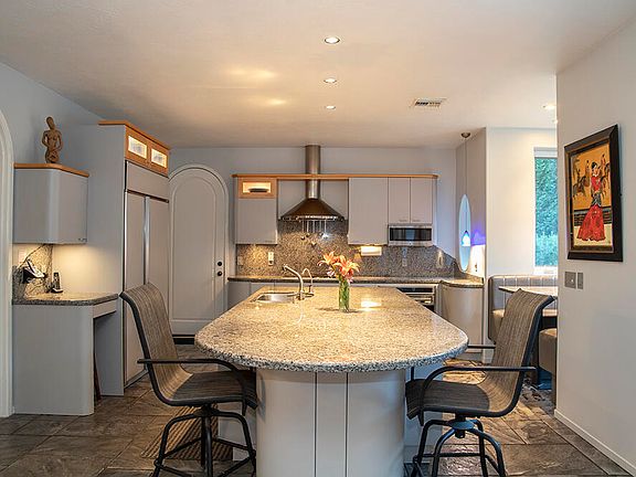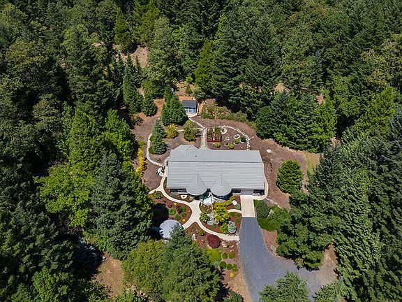 Custom Private Estate w/ 3 homes; Home, Guest House & Vardo on 14.3 acres. Stone & iron sec gate, 2 separate driveways: (Round House)1486 s/f, large one bedrm, large office (could be a 2nd bedrm), 9' ceilings, triple pane windows, 8' arched solid doors, radiant heated flrs, heat pump & gas fireplace. European style cabinetry, Sub-Zero, Wolf, Brazilian ''Tigers Eye'' granite. Stone/Slate shower. Concrete tile roof, ft thick walls inlayed stone/quartz. Garage w/ W/D. Guest Hm (Pacific NW Style) Board & bat, Metal roof, 1056 s/f, 1 bedrm, forced heat/air, kitchenette w/ stackable w/d hook-up. Garage, back-up Diesel generator, fenced back yard. 128 s/f, ''Vardo'' w/bed, bath/shower, bult-ins, w/d. Full RV hook-up. Carport. Seasonal creek, pond, walking bridge, gardens, pathways, night spotlights, irrigated, deer fenced & cross fenced. 15 gpm well log, 2 septic systems – all permits on file incl Permit for future Shop w/ Bath. Fruit trees & Incredible Landscape. Borders 43188 acres of BLM.