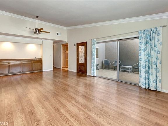 Welcome to your new home in 55+ Huntington Landmark! This 2 bedroom, 2 bathroom Marina model has been upgraded throughout. As you enter the private front courtyard, you’ll notice the beautiful tile and the exquisite custom wood and glass front door. The light and bright living room welcomes you with a soaring vaulted ceiling, elegant crown molding, and a sliding door that opens to the front courtyard. As you look around the home, you’ll notice all newer doors and dual pane vinyl windows throughout. The warm, clean laminate floors, the smooth scraped ceilings, and the crown molding flow throughout the home as well. The kitchen boasts custom cabinetry, granite countertops, recessed lighting, and stainless-steel appliances with a wonderful view to the courtyard as you stand at the sink. The home also includes a newer stainless front load stackable washer and dryer. The bathrooms have been remodeled with newer cabinets, counters, fixtures, tile and a jetted tub in the front bathroom. As you make your way to the master bedroom, you’ll notice the walk-in closet as well as the sliding door with access to the back patio and no neighbors behind, providing a nice backyard experience. The home is situated such that it enjoys a wonderful flow-through ocean breeze, but stylish ceiling fans have been added to enhance the dining area and master bedroom. Huntington Landmark has resort-like grounds and numerous amenities including two pools, a large putting green, tennis courts, pickleball courts, gym, billiard room, wood shop, library, ceramics, and so much more. Close to shopping, post office, restaurants, and the beach. Welcome home!