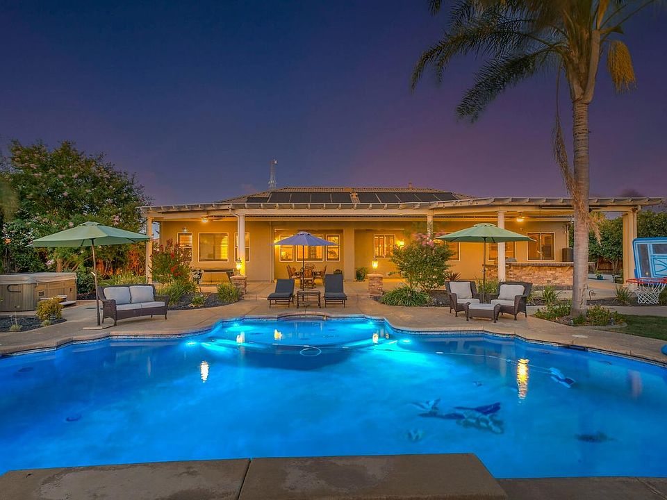ON A HOT DAY- ENJOY this POOL!! WELCOME to your SINGLE STORY home, walk through a private patio entrance thru the front door revealing a resort-style pool and spacious backyard. This home on a 1/2-acre lot boasts 4 bedrooms, 3 full baths, and a seamless layout. The primary and secondary bedroom suites offer privacy, while 57 owned solar panels emphasize energy efficiency. RV/boat access and a LARGE DETACHED GARAGE accommodate cars, boats, RV. The remodeled kitchen features granite counters, glass tile backsplash, and high-end appliances. The primary bath boasts a soaking tub and rain shower. Modern comforts include newer HVAC and a whole house fan. With 10' ceilings, plantation shutters, surround sound, and a focus on outdoor living, this home is like living on vacation. The outdoor space features a built-in BBQ, gas fire pit, and a captivating SALTWATER POOL. Upgrades worth over $370,000 A MUST SEE IN PERSON!!
