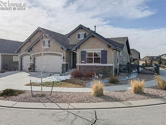 This stunning ranch is the perfect place to call home. From the moment you arrive at the corner lot the gorgeous landscaping catches your eye. Inside the vaulted ceilings captivate with picturesque windows filling the home with natural light. The main level has hardwood flooring through much of the main area with a carpeted living space for warmth needed in the Colorado climate and a fireplace to keep the space extra cozy. The living area, kitchen, and dining area flow seamlessly together making the space perfect for entertaining and spending time with loved ones. The kitchen boasts rich dark wood cabinetry with ample space for storage, stunning stainless steel appliances including a gas range and double oven, and plenty of counter space with granite countertops. Adding to the appeal for this home being the perfect place to entertain is the walk out dining area that opens to the backyard with cement patio and gazebo for those summer evening bbq's. The main floor also has two bedrooms and two full baths including the master bedroom and ensuite bath. The master is spacious as you enter through double doors and has the same natural light flowing through as the rest of the main level. The master also features a private seating or exercise area, walk in closet, and large master bath with split double vanity, soaking tub, and walk in shower. The basement level is just as grand featuring a large family room with a wet bar. The basement has bedrooms two and three and a full bath. The Banning Lewis Ranch community has amenities galore, including neighborhood schools, over 75 acres of parks/trails/open space, tennis courts, basketball court, rock climbing parks, zip-lines, access to pools, splash pad, water park, and dog park. Recreation center houses a fitness center and also regularly hosts classes and events for all ages. In the summer months, catch a neighborhood concert, festival, food trucks, farmers market or enjoy other regular community events.