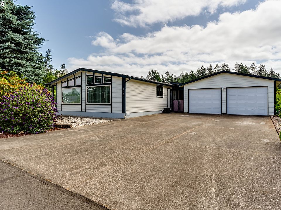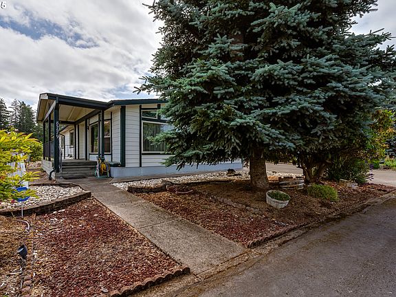 MOVE-IN READY! New roof installed 2025, new carpets and home has updated hardy plank siding. Welcome to Staffordshire, a 55+ gated community offering peaceful living on the edge of Eugene where you own the land. This spacious double-wide manufactured home features 3 bedrooms, 2 bathrooms, and multiple living areas including a family room, living room, and formal dining space. The kitchen is equipped with granite counters and plenty of cabinet storage. Enjoy the convenience of a laundry room with a deep utility sink and an extended garage with shop space. The primary suite includes a walk-in shower for added comfort. Relax on the covered patio overlooking the chain-link fenced backyard with a tool shed for extra storage. A pellet stove adds warmth and charm during cooler months. Seller completed an inspection and completed repairs. Don't miss this opportunity for low maintenance living in a desirable community.