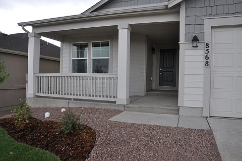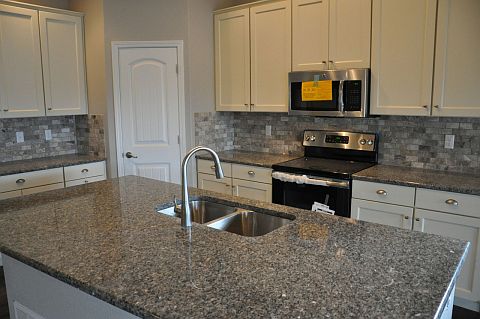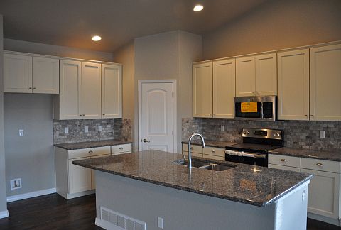 Ranch elevation "A" with covered front porch. 4 bedrooms, 3 baths, and 3 car garage. Master Bedroom plus one bedroom on main level. Kitchen includes 42” uppers with antique white maple cabinets, granite counter tops, under mount sink, stainless steel appliances including smooth-top electric range, built-in microwave above, and dishwasher. Finished basement. with 2 bedrooms, rec room, and 1 full bath.