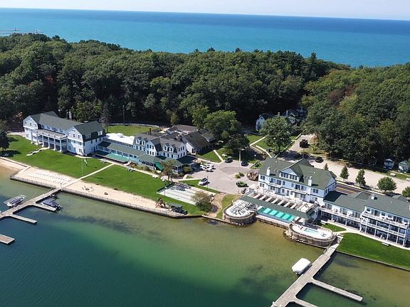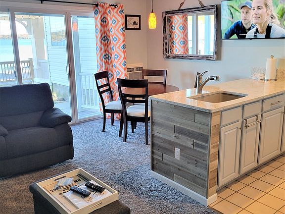 A beautiful one bedroom, ground floor, lakefront condominium in the Terrace Building. Part of the Portage Point Inn & Marina, a complex right on the sandy beaches of Portage Lake and only steps away from miles of sandy beaches on Lake Michigan. New outdoor infinity edge pool and hot tub next door. The purchase is turn key with all the furnishings included. Great income rental property. You have access to the resort amenities like beach furniture, fire pits, shuffleboard, playground, pool & hot tub, and lawn games. Our marina is steps from the unit where you can keep your boat. Great fishing on the lakes & streams. Golf, Casino, Crystal Mtn. Skiing, and snowmobile trail closeby. Resort Amenities: Outdoor pool, outdoor hot tub, playground, shuffleboard, sandy beaches with beach furniture o