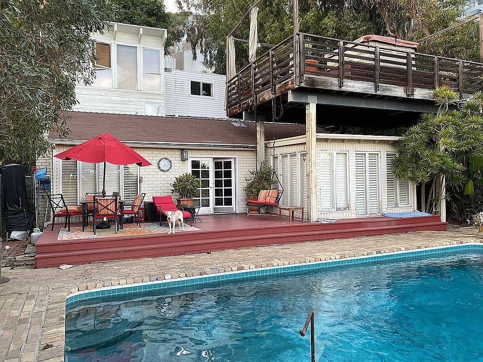 Nestled in the historic Hollywood Hills of Laurel Canyon, with views of the city, canyon and mountains. In-ground pool, deck with jacuzzi, open floor plan. Gated, pvt & tranquil this home exudes warmth & charm. Enter into the cozy yet spacious livrm w/its log burning firepl & ample din area that over looks the lrg patio w/black bottomed pool. There is a 2nd flr deck featuring a lrg spa tub & incredible views. The eat-in kitch is lrg & bright w/white cabinetry & center island. The mstr bedrm is tucked away on the upper level w/view of Griffith Observatory and Hollywood sign.