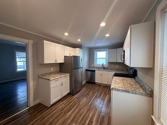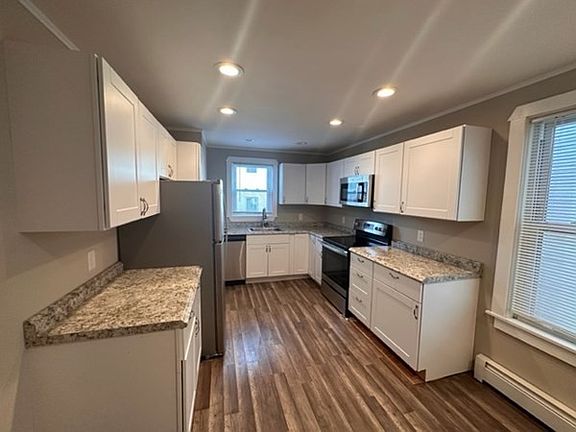 This charming two-story home, situated in the bustling center of New Bedford, offers unparalleled convenience to all local amenities. As you step through the front entrance, you'll be welcomed by a spacious double living room adorned with exquisite woodwork. The elegant dining room and generously sized kitchen add to the home's appeal. A convenient half bathroom is located on the first floor for your comfort. Moving to the second floor, you'll discover three expansive bedrooms and an exceptionally large full bathroom, showcasing the unique character of this residence.