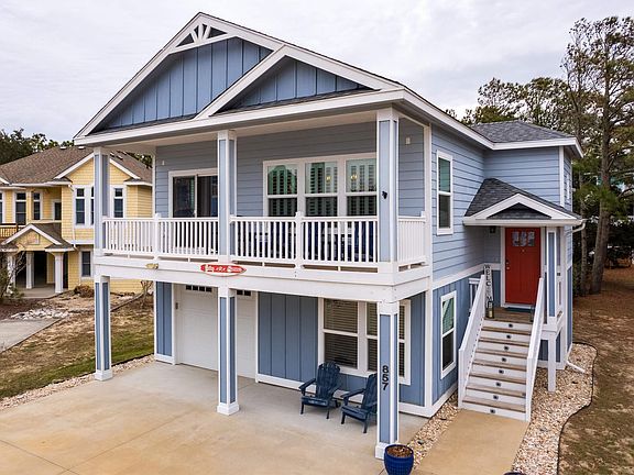 Great opportunity to own a like new home in Corolla NC! This home is fully furnished with high-quality furniture and beautiful art pieces in Monteray Shores and is a standout in Corolla. Just minutes from community amenities, restaurants, shops, and outdoor activities, it offers both convenience and coastal charm. Built in 2020 by Homes By Eillu and gently used as a second home, the property features a reverse floor plan with four bedrooms, two full baths, two half baths, and seamless indoor-outdoor living via multiple decks and a ground-level patio.