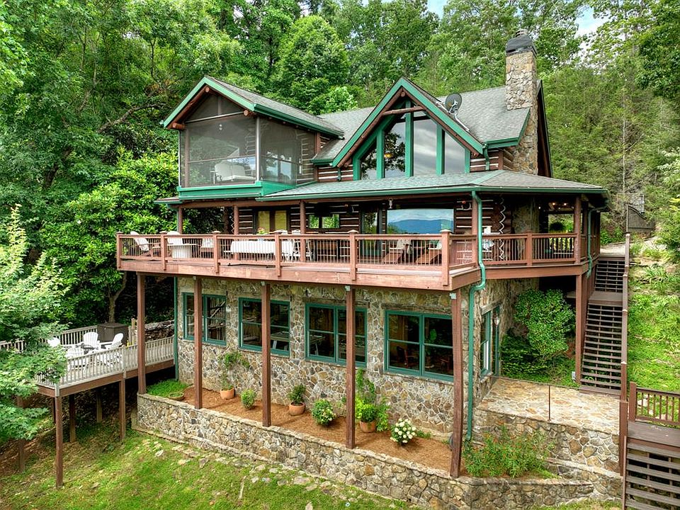 Perched atop the iconic Aska Adventure Area and just minutes from Downtown Blue Ridge, 857 Lakeview Drive is a rare legacy estate that blends timeless log construction with modern mountain luxury. Nestled behind a private gated drive and surrounded by native Hemlocks, this stunning timber-frame retreat offers year-round, layered views of Lake Blue Ridge and the Blue Ridge Mountains—an inspiring setting that feels remote, yet is easily accessible. Crafted with true log construction, the main residence showcases rustic elegance with soaring ceilings, exposed beams, and a wall of windows that frame the panoramic views. The open-concept design flows from a gourmet kitchen with premium appliances to expansive living and dining areas—ideal for entertaining or relaxing fireside. The primary suite is a peaceful escape, complete with a private screened porch with glass railings for unobstructed vistas. On the terrace level, enjoy a rec room with wet bar, a charming sunroom wrapped in rare reclaimed Chestnut-wood, and access to expansive wraparound Trex decks designed for gathering and taking in the natural surroundings. Just across the drive, the Coach House is a standout feature. This detached two-car garage includes a beautifully finished guest apartment with a full reclaimed Chestnut-wood kitchen, king bedroom, and ensuite bath. One wing offers a heated/cooled yoga studio, artist's loft, or office. The other features a potting room, dog wash station, and workshop. Additional features include high-speed fiber internet, whole-house generator, energy-efficient systems, full home surveillance, and gated access bordering the Chattahoochee National Forest. Whether used as a full-time home, private retreat, or luxury investment, this is mountain living at its most refined—where craftsmanship, comfort, and nature converge.