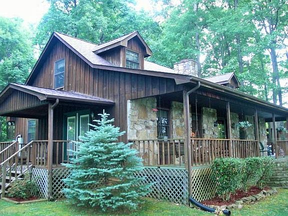 King of the Mountain, yet moments off the main road.Gorgeous Cedar/Stone Home offers many extras! 4 large bedrooms, 2 full baths shower/tubs recently updated tile,granite,Beautiful Hardwood floors in living room and soaring stack stone fireplace, large eat in kitchen has lots of built-ins, Huge Master Suite on main level with private covered patio,actually there are 3 over sized covered Porches. Detached 2 car garage with roughed in additional living quarters upstairs that also offers 2 lg wood decks. Whetheryou love Campfires, animals, entertaining, or just Beautiful surrounding this is it! List of recent updates to home available. Must See!!