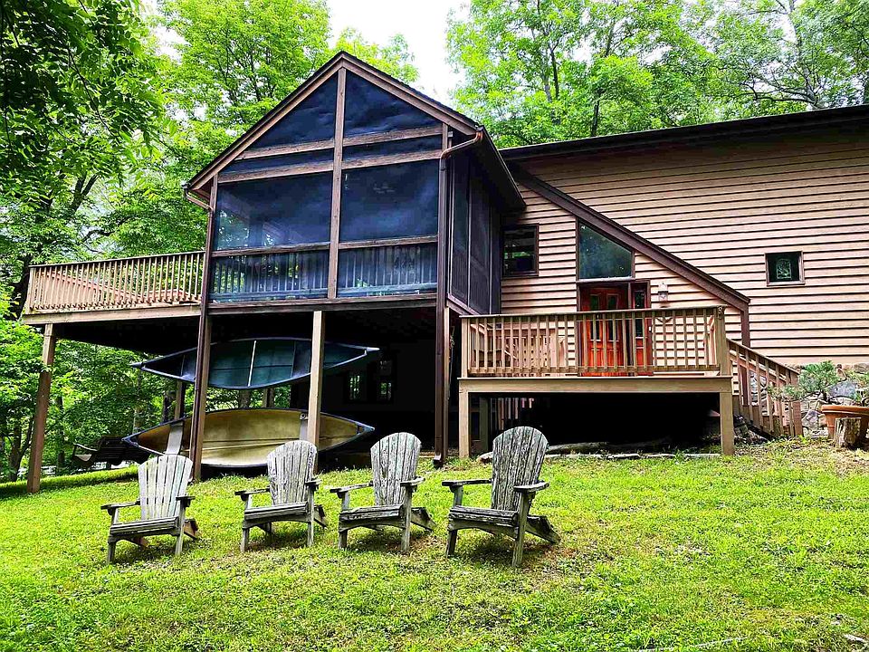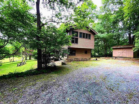 Stunning Stoney Creek tri-level floor plan on partially wooded lot that backs up to pond. Coming in from the side entrance you'll find a spacious mudroom with plenty of storage. The ground floor also houses three spacious bedrooms, two featuring sliding door access to the rear patio with views of the lovely pond. Main floor offers open floor plan with hardwood floors, wood trim, exposed beams and vaulted ceiling that fit perfectly with the cabin feel of this home. Floor to ceiling windows, cozy fireplace with media recess above and built-in shelving on either side. Kitchen offers plenty of cabinets and lots counter space including bar top style eating area. Living room/dining room has double sliding doors offering plenty of bright natural lighting and access to the full length back deck. Kitchen offers sliding door to screened in side porch. Master bedroom is upstairs and nicely separated from the rest of the home and offers two tiers for a sleeping area and sitting area. Large master closet. Outside storage shed.
