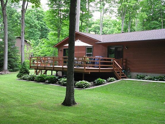 Country Ranch, 3 bedrooms, 2 full baths, eat-in kitchen, large living room with hardwood floors and cathedral ceiling. French doors to rear deck, skylights, accessory building, large outdoor deck, very private wooded 1 acre lot.