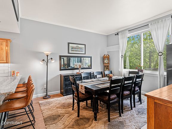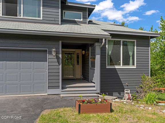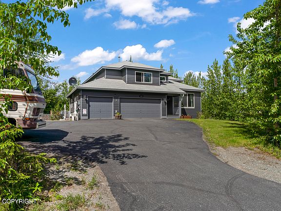LARGE custom home with plenty of space to spread out... and an assumable loan at 2.45%! Large primary plus 3 more bedrooms upstairs, and 2 bonus rooms plus a generous family room (and sauna!) in the finished, walk-out lower level, plus two large bays of high-ceilinged storage. Spectacular kitchen remodel, Pioneer Peak and Talkeetna views, and a private corner lot.It's a spectacular commute location to anywhere; just a few turns to Trunk Road and right between downtown Palmer and downtown Wasilla. Features such as high ceilings, a grand double-height entry, abundant trim for an old-world look, built-in shelves and decorative nooks, and a beautiful indoor sauna make this home stand out from its high-square-footage peers. The layout is eminently usable and makes the home feel even larger, with a kitchen, breakfast nook, formal dining room, and a tucked-away living room offering an abundance of spaces for family and entertaining. The four bedrooms on the upper level, including a generous primary suite with a jetted soaking tub, offer options for families or work-from-home folks with a variety of needs, while the two bonus rooms and family room downstairs offer space for guests, home offices, teenagers, or whoever needs a bit of space - or potential for an easy conversion to a 2BR apartment, with an existing bathroom and space to add a kitchen, and a separate entrance from the rest of the house. Updating has been thorough, including new Anderson windows on the front of the house and the front door. One garage bay has been converted to a home office; this was done in a fashion so as to be easily removable, should the third bay be needed in the future for vehicles (home office space not included in home square footage). There's a large deck outside, with spectacular views in summer and winter, and plenty of parking for vehicles and toys up to RV size. Minutes in either direction to downtown Palmer or Wasilla, and just 33 minutes to the JBER exit or 41 minutes to the first stoplight in Anchorage. Larger homes like this, in excellent shape and with a short commute - especially with the easy conversion to an in-home apartment downstairs - don't come available very often. Call an Alaska real estate licensee to set up your showing today.