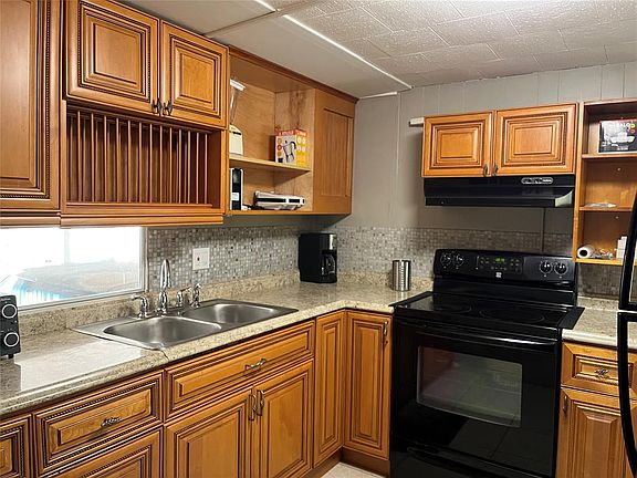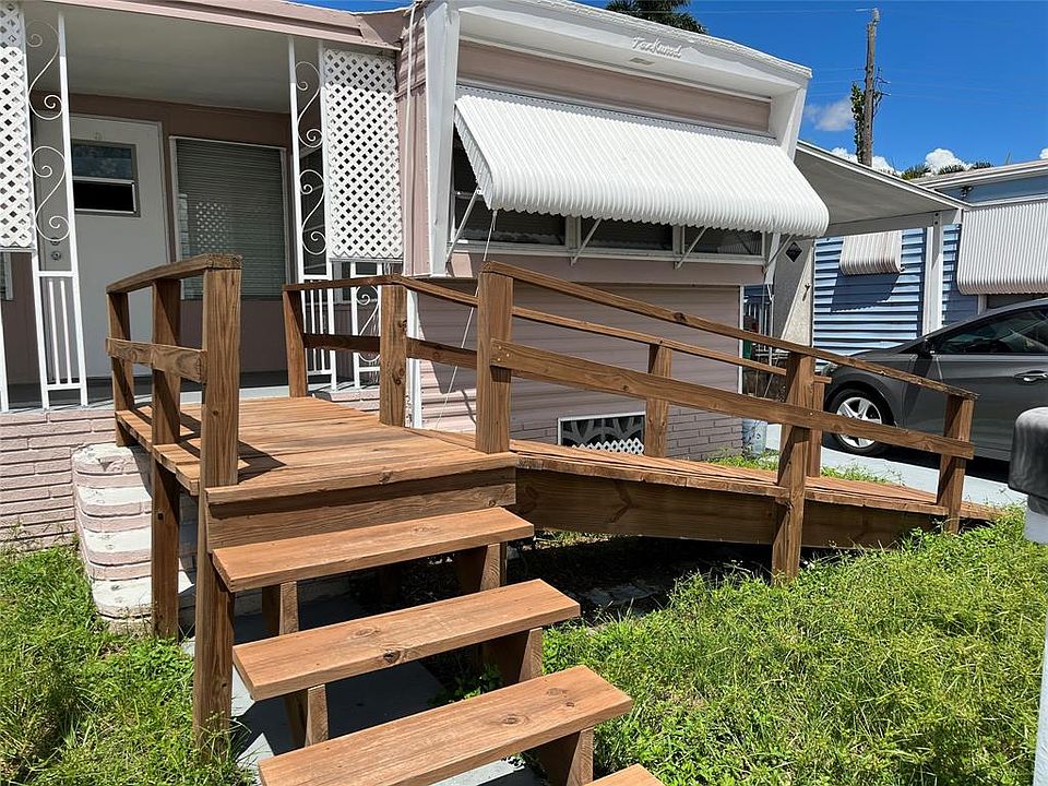3 bedroom 2 bathroom . Private entrance and covered porch with wooden decks on two of the bedrooms. Upgrades include new wooden kitchen cabinets, newer appliances, tile floors through out, new A/C window units. Use the ramp and stairs for easy access. Plenty of storage indoor and outside storage shed includes washer, dryer and laundry tub. Very low maintenance fee. 55 Plus Community with 2 clubhouses, miniature golf, social activities and 3 pools. You own the land. Shopping and restaurants close by. Broward County Transportation available at your front door.