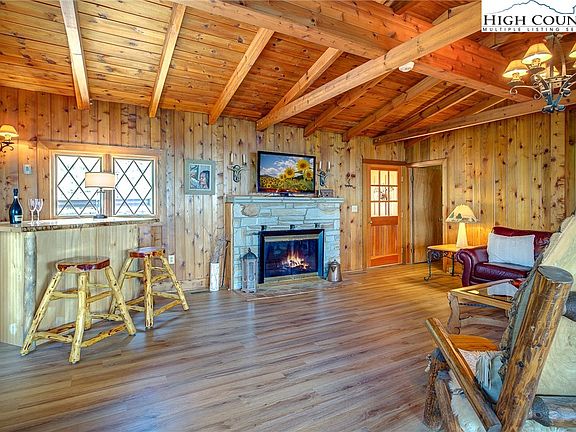 Classic Blowing Rock home with 180 degree LONG RANGE LAYERED VIEWS! This home is utterly charming, and offers sleeping space for everyone in your group. Enter to a warm and comfortable living room with new flooring, classic wood ceilings and walls, and a woodburning fireplace. Proceed to the open dining and large living area with floor to ceiling windows and VIEWS! The kitchen showcases a coveted propane AGA stove and granite counters. There are four bedrooms on the main level, three with their own baths. The main floor opens to upper deck through three separate exits to enjoy the view from the entire back of the property. The lower level is currently used as two bedrooms where you can wake up to those views from floor to ceiling windows. The primary suite has a cedar walk-in closet, shower, and a jetted corner tub. Both downstairs bedrooms outside entry to the decks. Step outside to the huge lower deck entertainment area with an open deck, stone firepit, and small garden area. In front of the house is a fenced yard, and just one step up to enter the home. The home and all decks have just been stained and painted. New roof in 2019, HVAC replaced 2017. See 3D tour.