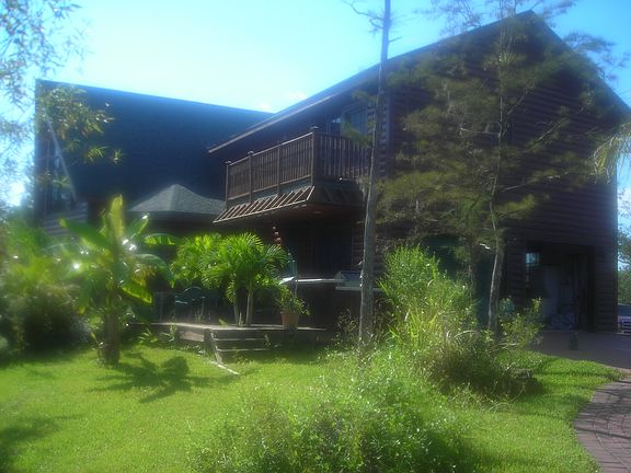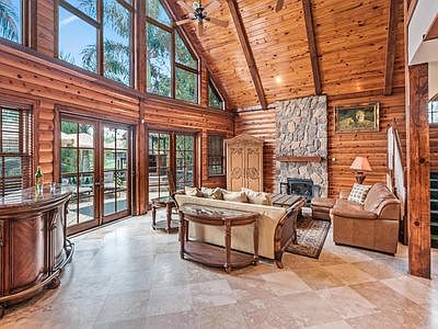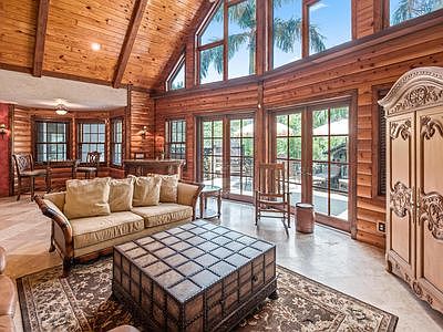 Built in 2005 & complete with hurricane impact windows, this incredible, one-of-a-kind log cabin is nestled on a charming, gated & fenced 1.2 acre corner lot complete with fishing pond. Soaring ceiling heights & floor-to-ceiling windows draw incredible light. Born of Mahogany, Canadian White Cedar, & Saturnia Marble, this 4BR+ den/office, 3 full bath home includes an detached & air-conditioned 300 sf cottage that could serve as a workshop, gym, yoga, Pilates, or wellness studio, office, or hobby room. The huge upstairs master suite balcony features relaxing views the pond. All AC's are brand new. New back deck. All paved roads. Circular driveway w/ 2 wrought iron gates. Completely move-in ready. Once in a life time opportunity to own the country log cabin of your dreams! Don't miss out!