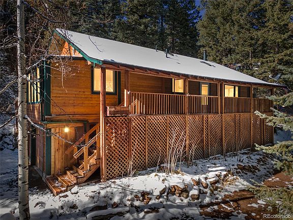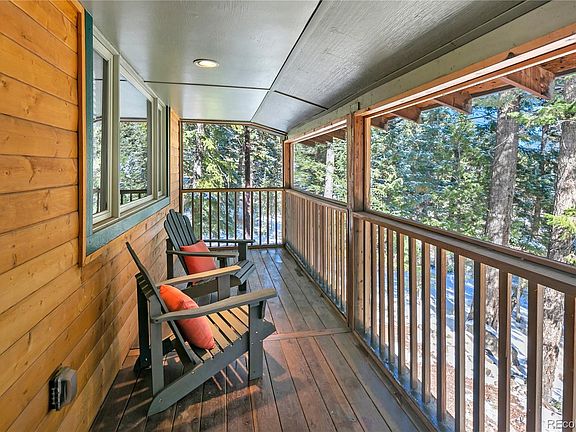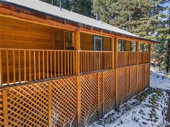 Cozy and charming mountain home conveniently located 5 minutes from the town of Conifer and 10 minutes to "down the hill". Enjoy sunrises in the morning and Denver city lights at night from the screened-in front porch, or take a quiet nap while lounging on the back deck. This home is full of rustic charm, with wood floors throughout the family room and kitchen, wood paneling, skylights for added brightness, and a beautiful woodburning stove and intricate rock hearth. Bathrooms have all been updated, new granite kitchen floors and stainless-steel appliances. The sunroom provides about an additional 200 sq feet of living space which is not included in the total square footage and can be used as a sitting room or office. The family room downstairs has a gorgeous custom built in entertainment center, complete with an electric fireplace. The television and surround sound are included. The back deck is spacious and inviting, and it is surrounded by lovely perennials. The roof was replaced in 2020, along with much of the siding. The house has also been recently stained. 3rd bedroom in the basement is non-conforming (no window), and the septic is rated for 2 bedrooms. Oversized two car garage and 3 sheds/outbuildings. Snow blower included!
