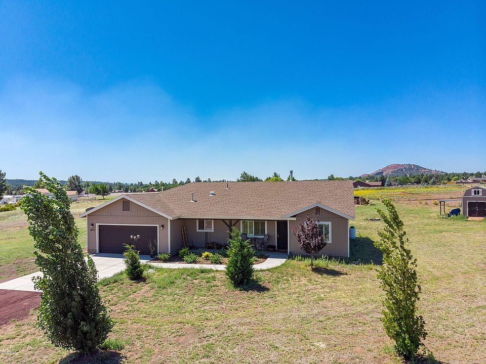 Beautiful, highly desired split/open floor plan home with vaulted ceilings that greet you as you enter. Windows have been upgraded with plantation shutters. Kitchen hosts Knotty Alder custom cabinets, upgraded chipped edge granite counter tops, stainless steel appliances and brushed nickel kitchen fixtures. Master bedroom has private master bath with walkin shower, rain shower head and tile walls and floor. All bathrooms have Granite counter tops. Custom upgraded ceiling fans and Solid core doors, NEW A/C to name just a few of the upgraded features. Covered porch in front and back. Shed out back to park your tractor or toys under. Fenced area for your chickens and farm animals. Gorgeous panoramic views and delicious fruit trees make this home truly one of a kind in Doney Park.