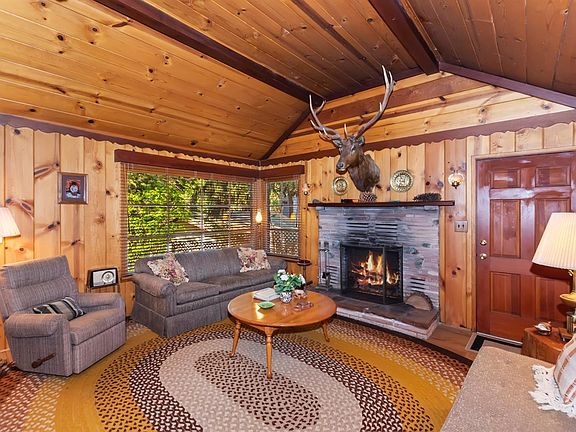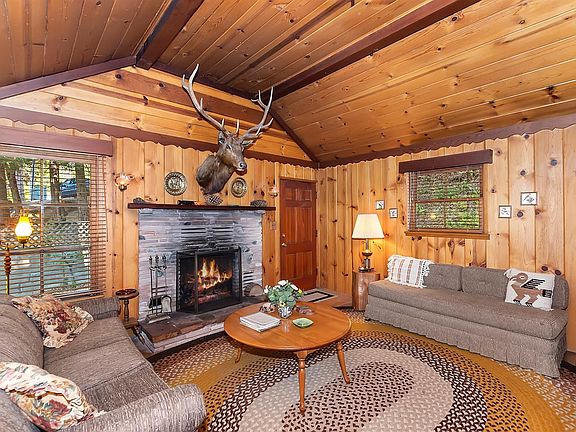 This Charming cottage in the trees has been loved since it was built by the same owners. Step inside to a one level home with tongue and groove ceilings and walls. Vaulted ceiling in living room with a wall of windows. This home comes completely turn key. Two bedrooms and bath off kitchen. Patio area to enjoy the outdoors. Walking distance to Lake Gregory. Easy drive in to town. Lake Gregory has access with pass for swimming, fishing, walking trails and so much to offer.