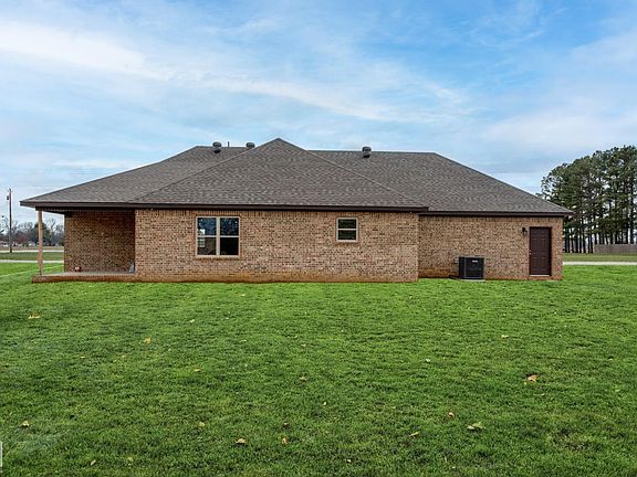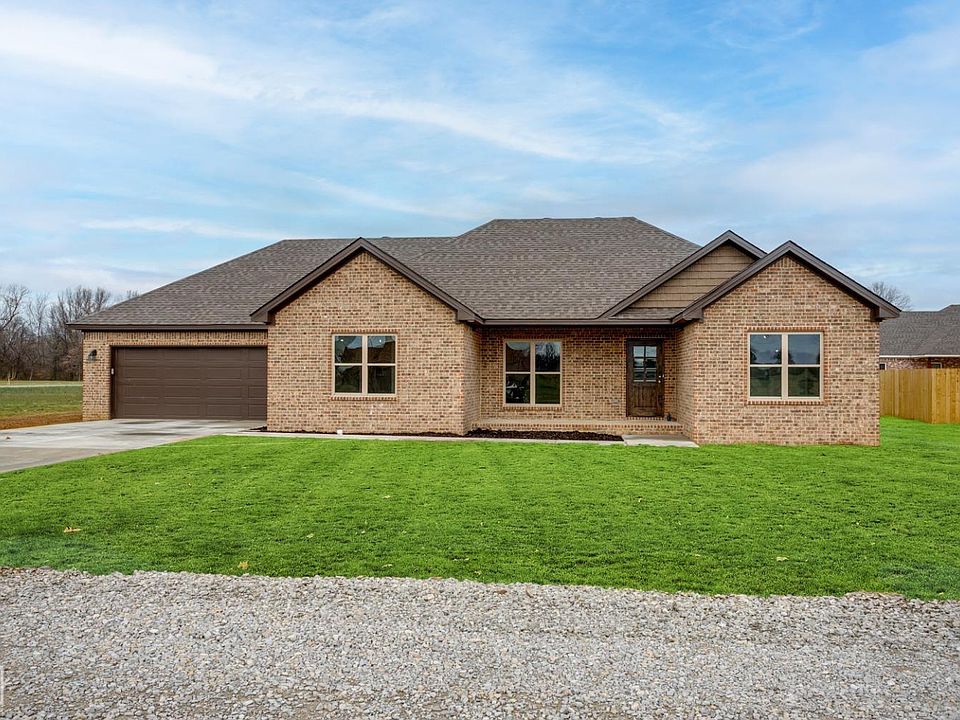Welcome to this stunning brand new construction home, perfectly designed to offer both comfort and style. With its spacious layout and thoughtful features, this home is sure to impress. As you enter, you are greeted by a bright and airy living room, seamlessly flowing into the dining area, creating a generous 18' x 37' space for entertaining and relaxation. The acid stained flooring throughout adds a touch of elegance, while the custom tongue and groove ceiling in the living room adds a unique and charming detail. The kitchen is a true culinary masterpiece, featuring granite countertops, a large island, and custom cabinets that provide ample storage space. The stainless steel appliances add a modern touch, while the pantry ensures all your cooking essentials are within easy reach. Whether you're preparing a quick meal or hosting a dinner party, this kitchen is sure to exceed your expectations. The primary bedroom is a tranquil retreat, boasting a spacious layout. The en-suite bathroom is a true oasis, complete with a double vanity, perfect for morning routines, and an oversized shower, offering a luxurious spa-like experience. Two additional bedrooms provide ample space for family members or guests, each offering comfort and privacy. The second full bathroom ensures convenience for everyone, with its modern fixtures and tasteful design. Step outside onto the large 12' x 12' grilling porch, where you can enjoy outdoor dining and entertaining. The meticulously crafted brick exterior with vinyl trim adds a touch of sophistication and durability to the home's facade. Storage is never an issue with the 4' x 18' storage room in the garage, providing ample space for all your belongings. With a total of 1,874 square feet, this home offers plenty of room to grow and create lasting memories. Located in a desirable neighborhood, this home offers the perfect blend of modern amenities and timeless design. Don't miss the opportunity to make this house your dream home.