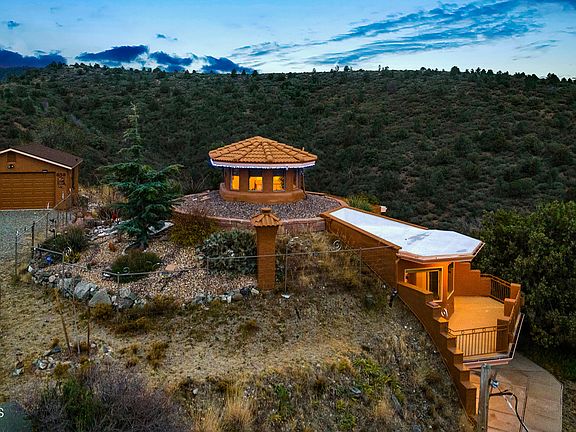 One of the most unique & eco-friendly homes in Yavapai County. Beautiful SUSTAINABLE ENERGY EFFICIENT Earth-Sheltered home (not made of earth) designed by Formworks Building. 2 miles from historic downtown & borders State Trust Land. The panoramic views are ABSOLUTELY AMAZING. Bathed in natural light, this open floorplan has 2618 Sqft, curved ceilings. 2 stories & a cupola, 2 bedrooms, 1 office/bedroom, 3 bathrooms, 2-car detached garage on .99 acres. SUPERIOR STRUCTURAL INTEGRITY ADDS EXTRA PROTECTION AGAINST NOISE, EXTREME WEATHER, FIRE & OTHER NATURAL DISASTERS. Natural solar and geothermal properties lower cost of heating & cooling by 50 - 90%. !!!! MUST READ VERY IMPORTANT INFO UNDER ''DOCUMENTS TAB'' !!!! But wait, there's MORE...