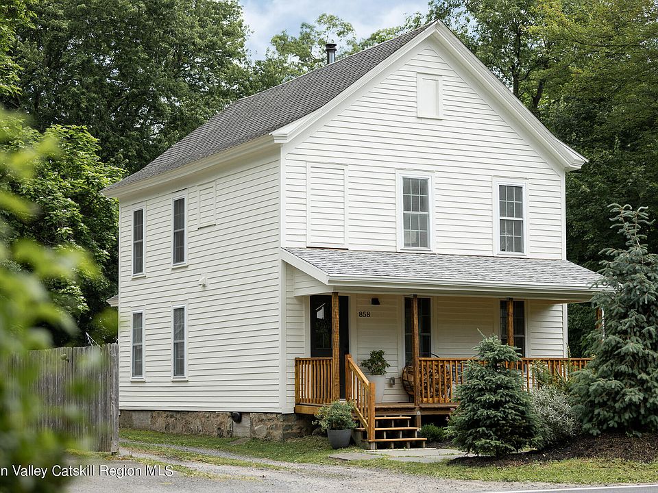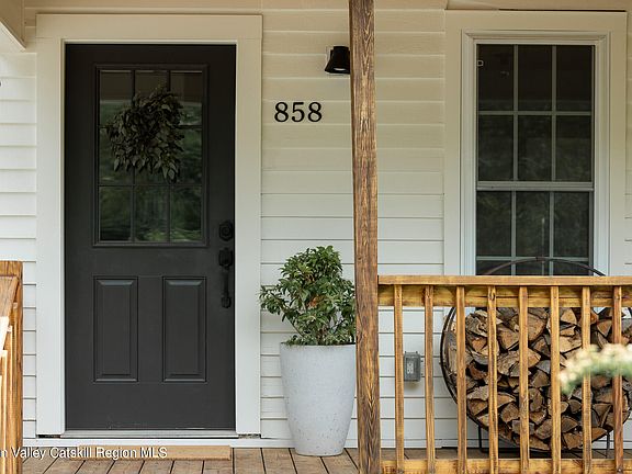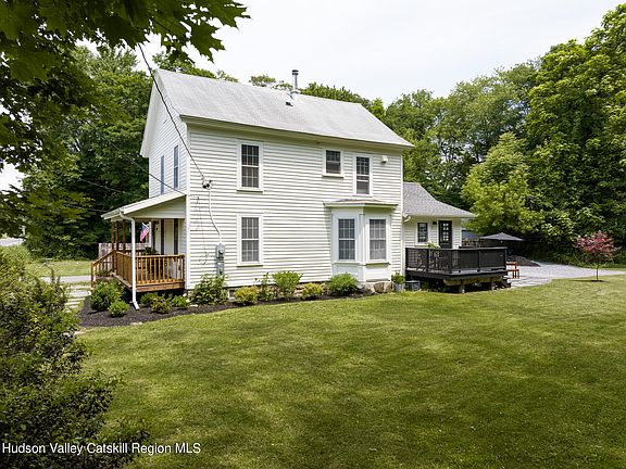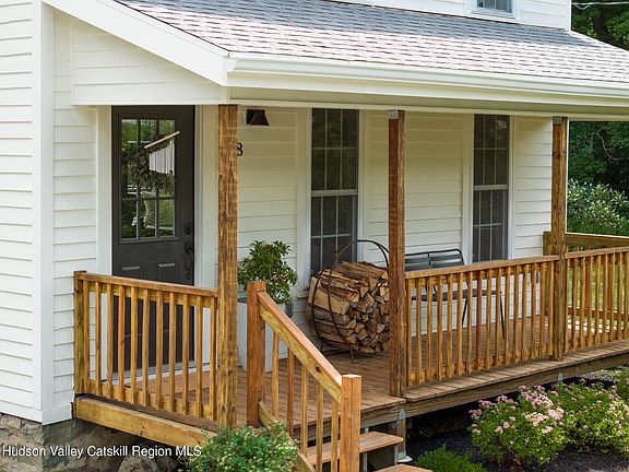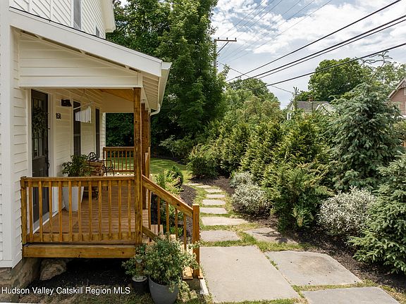 Tillson Farmhouse is a light-filled and updated antique farmhouse, with radiant heat floors and designer finishes, lending it a modern lofty feel. Originally built in 1939, this home was gut renovated just a few years ago, and has been meticulously finished and styled by its current stewards. Set on a landscaped half acre lot in the charming hamlet of Tillson, in the Town of Rosendale, this modern farmhouse beckons buyers looking for a ''best of both worlds'' living situation. The warm white facade of the home is tucked behind a Hugelkultur berme at the front of the lot, loaded with native evergreens and shrubs that offer both a pollinator haven and privacy. Enjoy relaxing or playing a game of bocce on the grassy lawn, dinner parties al fresco on the bluestone patio, or evenings around the fire pit under the stars. Inside, the home exudes warmth and charm from a mix of original character - like the staircase with original woodwork - and scandinavian inspired finishes. The first floor features an open flow, seamlessly blending living, dining, and kitchen spaces - and centered around a wood stove hearth. The dining area features a bay window, with romantic built-in window seat, overlooking the verdant yard. This level also includes a bedroom, currently configured as an office and TV room, as well as a powder room. Up the stairs, with beautiful original patina, are two more bedrooms - including a large primary with multiple windows, and plenty of room for a king-size bed. On this level is also a spa-like full bathroom, with double rainfall shower heads and a claw-foot soaker tub, finished with ceramic tile floors and walls, and poured concrete counter and shower seat. The upper level also features access to storage space in the walk-up attic. This home will satisfy both old house lovers, and minimalist design enthusiasts, alike. With original wood floors, beams, banisters, siding - and bright spaces with modern windows, mechanicals, and finishes - what's not to like? Just a 3 min drive from Rosendale's bucolic Main Street, with shops and dining, a 9 min drive from bustling New Paltz, and a 15 min drive from hip Kingston, this home is ideally situated among Ulster County's most desirable destinations. Tillson Farmhouse comes on market 6/21, with an Open House 6/23, 11am-2pm. Dont miss out on this perfect upstate home, in a ''town & country'' setting!
