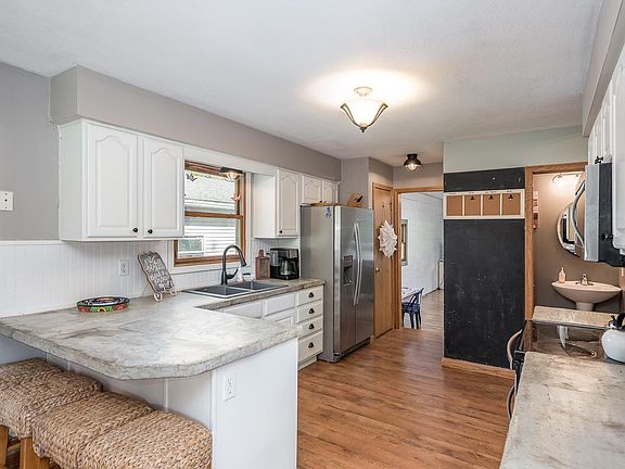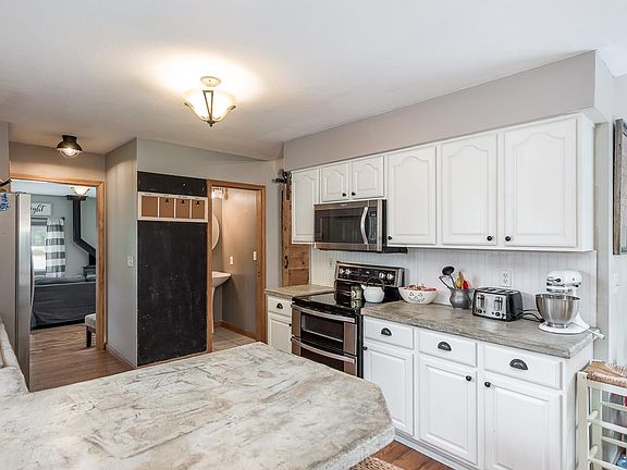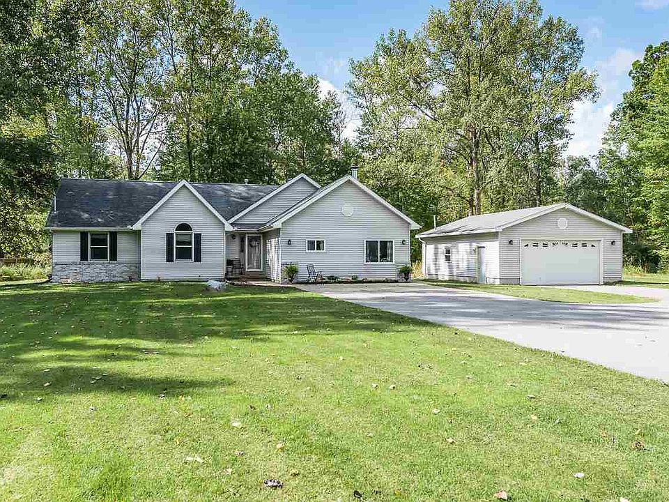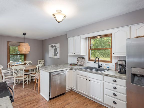 All main floor living ranch floor plan on 1 acre of land surrounded by mature trees. This home offers a vaulted living room with a gas fireplace and updated flooring. The kitchen has tons of cabinets, an eating bar, and breakfast nook. A main floor family room is tastefully decorated with shiplap, has a wood stove and the 4th bedroom is nearby. The master bedroom has a full bath and walk-in closet. 2+ car garage, huge yard, natural gas, and city water. Super cute home located on a quiet country setting close to schools and the Chippewa Nature Center.
