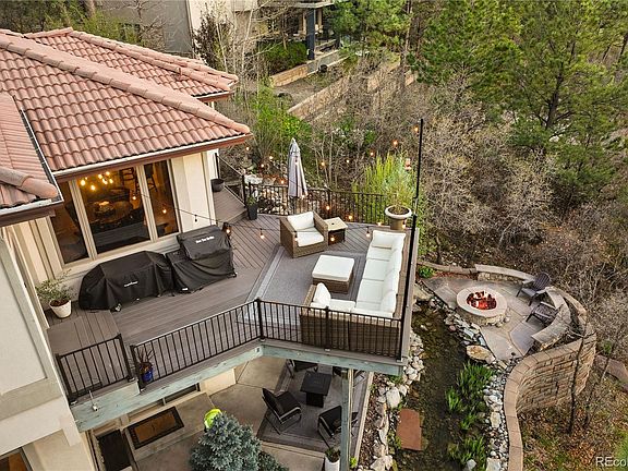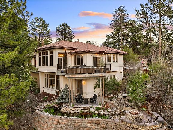 Set on a private .75-acre lot, 858 Swandyke Drive is a walk-out ranch crafted for refined living and exceptional entertaining in the coveted, gated Village at Castle Pines community. Surrounded by mature pines and elevated western sunset views overlooking the Cherokee Ranch open space, this property offers a rare blend of privacy, scale, and natural beauty. A newly updated dining room with dramatic stonework sits just off the foyer, setting an elegant tone upon entry. The remodeled kitchen features custom cabinetry, high-end appliances, and flows effortlessly into the great room, showcasing a floor-to-ceiling stone fireplace, outdoor access to a deck with brilliant evening twilight hues, and large windows highlighting the forest surrounding the home. Cozy and expansive at the same time, the primary suite includes a private balcony, gas fireplace, dual walk-in closets, and a newly updated spa-like bath. A guest bedroom, full bathroom, office with built-in shelving, and a sizeable laundry room complete the main level. Downstairs, the finished walk-out lower floor includes an enormous recreation room with gas fireplace, perfect for entertaining, and two additional bedrooms with a dual-access bath. The custom-built theater room and game room with fully renovated bar create a true entertainer’s haven. Exterior highlights include a composite deck, built-in gas fire pit, a 80’ water feature with cascading falls, additional patio, a great area for a back yard, and a flagstone path encircling the home. The oversized 3-car garage boasts 11’ ceilings and can fit a 24’ boat. Additional updates include a new 100-gallon water heater, new AC (2018), sewer line (2025), as well as interior paint, flooring, and lighting. Sitting adjacent to a wildlife corridor with striking sunsets from multiple outdoor spaces and a setting tucked into the trees — 858 Swandyke Drive offers true Colorado living at its best.