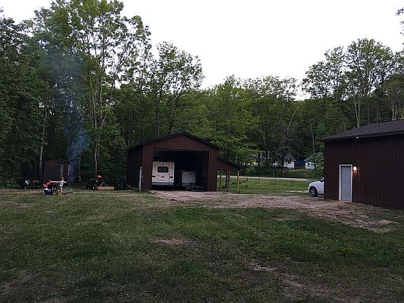 1496 square foot building (44' x 32'). Built 2018. Metal roof. Front pouch. Two man doors and 13 foot high by 16 foot wide overhead door. Opposite end is framed for a 12' by 16' overhead door. Clear ridge vent 44' long. New 5 inch well, septic and drain field 2008. 30amp RV plug interior and exterior. Rv septic dump stations inside and outside of building.