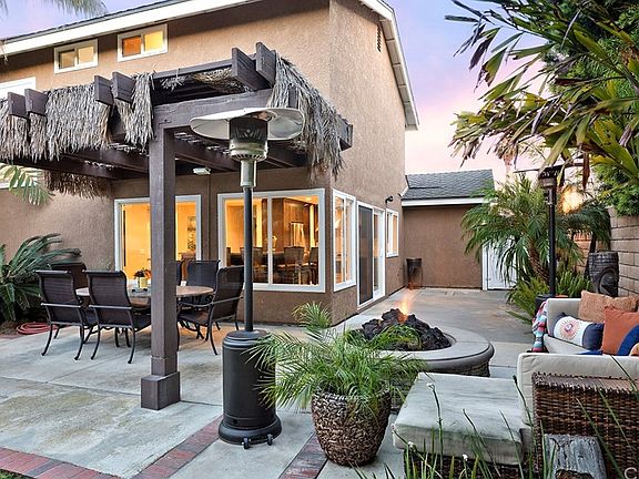 This incredible Landmark home sits on a picturesque corner lot in a quiet and desirable neighborhood close to shopping, the beach, and excellent schools. The unique corner lot location affords the luxury of convenient RV access and a 3-car garage. Upgrades are abound in this ideal family home, including custom moldings, baseboards, recessed lighting, plantation shutters, and more. The entry greets you to travertine tile leading to the breathtaking chef's kitchen, complete with rich soft-close cabinets, a stunning granite and quartz island with an abundance of counter space and room for seating, granite counters, and Bosch stainless steel appliances. The cozy living room, with its gorgeous fireplace with a custom surround, offers the perfect place to relax with a book or enjoy a family movie night. Wide sliding doors from the kitchen offer access to the idyllic entertainer's backyard, complete with tiki torches that are conveniently attached to a gas line scattered throughout the mature palm trees, allowing for a perfectly lit outdoor space. Hang out under the covered patio, in the spa, or by the fire pit for a relaxing evening in your private paradise. Upstairs you will find three bedrooms and an office space with built-ins that can easily be turned into a fourth bedroom. All the upstairs bedrooms have large closets, ceiling fans and large windows that allow for ample natural light. This family-friendly home in this highly sought after neighborhood is a rare find!