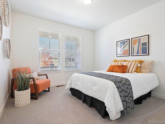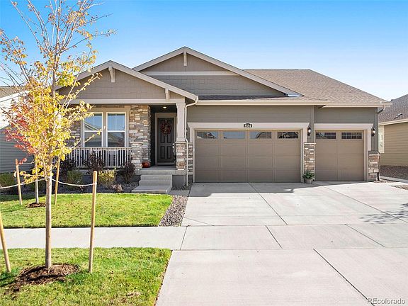 Welcome home! No need to wait on new construction when you can purchase this Davis Ranch plan by Lennar that has only been occupied for a month. The sellers have done the work for you with $50,000 in upgrades since closing. This newly constructed and thoughtfully upgraded home is located in the highly coveted 55+ community at Inspiration. The open-concept floor plan shows like a model, without the wait of a new build. The interior of the home boasts 4,075 sqft with 10' ceilings, luxury vinyl plank floors, energy efficient technology, and an abundance of natural light. The gourmet kitchen includes stainless steel appliances, a double oven, gas cooktop, and a large center island with quartz countertops. The interior continues with a dining room, living room with gas fireplace, primary bedroom with ensuite bathroom and walk-in closet, guest bedroom, office with french doors, guest bathroom, laundry room, mud room, and unfinished basement for future expansion. The exterior of the home features covered front and back patios, a fully fenced backyard, and a 3-car garage. Post-closing updates include a beautifully xeriscaped backyard with full drip system, concrete back patio and sidewalk, 4' split-rail fence, Hunter Douglas blinds throughout, Tesla(EV) charging station, Trimlight exterior holiday light package, and a Radon mitigation system. Inspiration active adult residents have exclusive access to the Hilltop Club. This resort-style clubhouse has a pool, tennis courts, bocce ball courts, pickle ball courts, fitness center, yoga studio, library, demonstration kitchen, meeting rooms, and an outdoor patio with stunning mountain views. There are countless community events, classes and clubs, including a free summer concert series. To learn more about the Inspiration 55+ community and events, please visit: www.inspirationcolorado.com. A true gem of a property! Schedule your private tour today!
