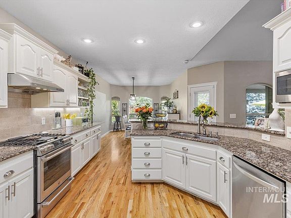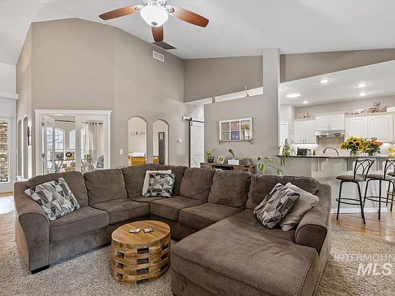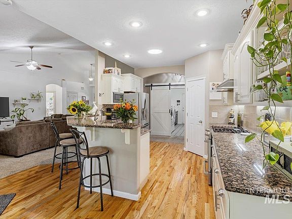 Impeccable single-level home with a bonus room, nestled in a private, park-like yard. Features include a 10 x 12 storage shed, 40ft RV parking with full hookups, including a dump station. Located at the end of a tranquil cul-de-sac, boasting a spacious 7-car driveway and an oversized garage. Ideally situated just minutes from shopping, hospitals, schools, and the airport, with convenient access to I-84. The well-designed open floor plan flows seamlessly into the beautiful outdoor space, highlighted by a covered patio—ideal for entertaining guests. Numerous upgrades include heated tile flooring in the master bath, a spa with a remote-controlled cover, and custom Christmas lights. This home is a must-see and promises not to disappoint!