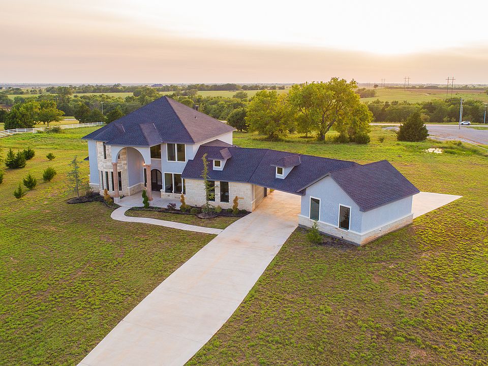 This magnificent 4 bedroom home is nestled on a quiet cul-de-sac on 5 acres. Comfortable and well appointed, this home offers the perfect setting for elegant entertaining and family gatherings. Country living in luxury with rustic elegance is what you will find. Starting with the grand entrance of double metal doors walking into an open floor plan with a large custom fire place as the hearth of the home. Kitchen counts with 2 dinning areas plus over sized island, high end double built-in oven, microwave drawer, a built-in wine refrigerator and your own pot filler. Master suite is downstairs that includes a cozy fireplace and architectural glass insulated wall to wake up with a fantastic view of nature. Enjoy a 3rd living area upstairs, with its own bar that leads to the large balcony, perfect to enjoy the outside view from above. Storm Shelter included, 4th car garage 5261 sq. ft of space that you MUST see in person to appreciate the beauty!