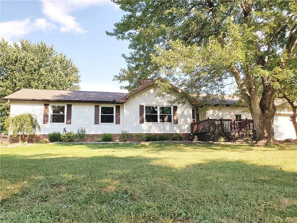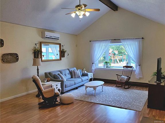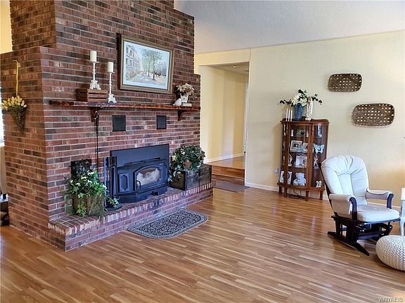 You can have horses in the pasture, a private stocked pond and a beautifully updated home if you are the new owner of 8585 Goodrich Road in Clarence! Situated on nearly 14 cleared acres the home has an open and airy floor plan. A tremendous size kitchen has center island, heated floor, tall cabinets, new appliances, stamped corian counters & tile floor. Stunning Great room has cathedral ceilings, woodburning fireplace and big,bright bay window.Wall to wall high-end luxury laminate flooring. Two full baths; one is split entry from master bedroom and hallway. First floor laundry room. All new windows! Huge heated sunroom adds to the space and enjoyment of all 4 seasons and overlooks massive patio. Excellent mechanicals: New roof house & garage (2013) 6 zoned high efficient boiler (2015) Hot water tank (2011) Mini-split a/c(2015) 2 sump pumps w/ h20 back-ups,200 amp electric service, LED lighting, Patio (2018) Carpeted basement. BARN: two story 50x31 concrete constructed to keep animals climate controlled, has horse stalls but could lend itself to any hobby enthusiast. Acreage is farmable, currently used as hayfield. Great house and property, hard to find acerage in Clarence.