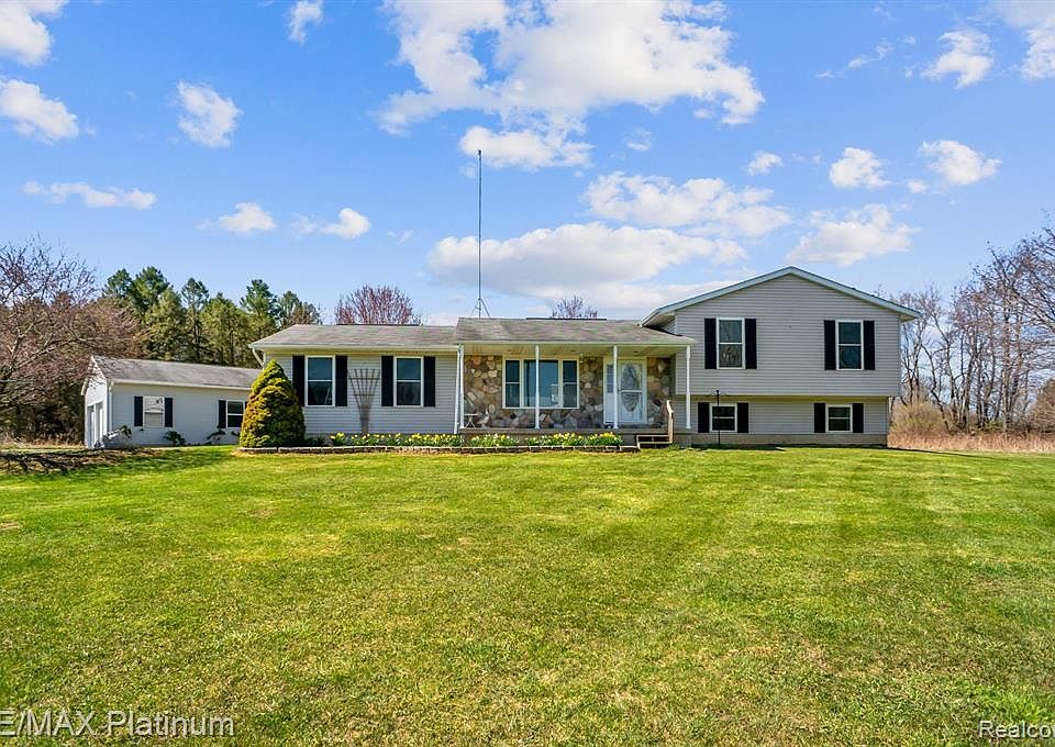 Beautifully renovated quad-level situated on almost 7 acres, boasting a private pond, abundant wildlife, & a fully finished 32x28 pole barn w/ 11' ceilings for a lift. High ticket upgrades throughout including new furnace/AC unit, new hot water tank, new carpeting throughout, new plank flooring, new trim throughout, new shutters, new storm door, & the entire home was just freshly painted floor to ceiling, all in the past 3 months! Open concept floor plan with the kitchen boasting a large amount of countertop space and breakfast bar for casual dining. Living room overlooks the serene setting, while the sun room offers immense natural light to enjoy all year round. Spacious master suite w/ his & hers closets & easy access to the bathroom w/ granite vanity & garden tub. Garden level offers natural wood burning stone fireplace, office area, & full bathroom w/ real stone shower & flooring. Basement level offers immense storage w/ built-ins & dog shower area. This country home has it all!