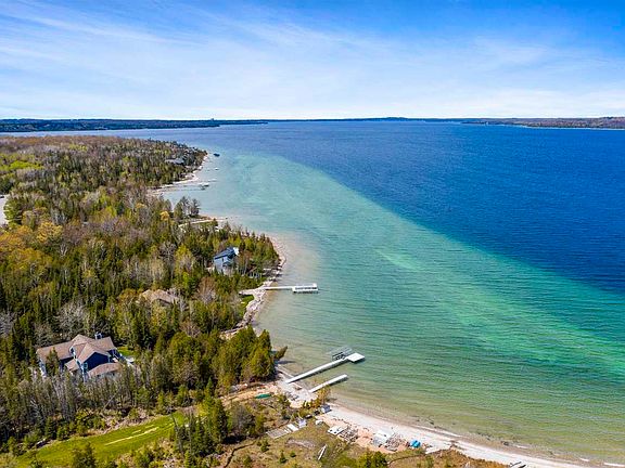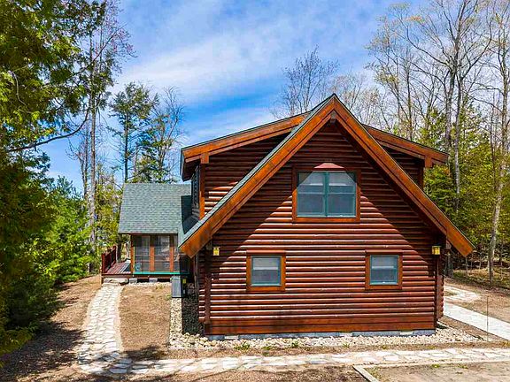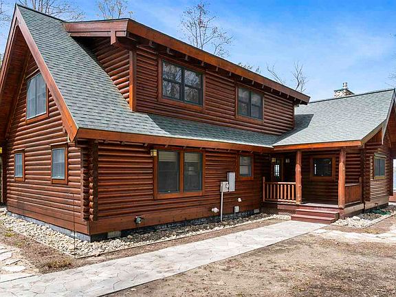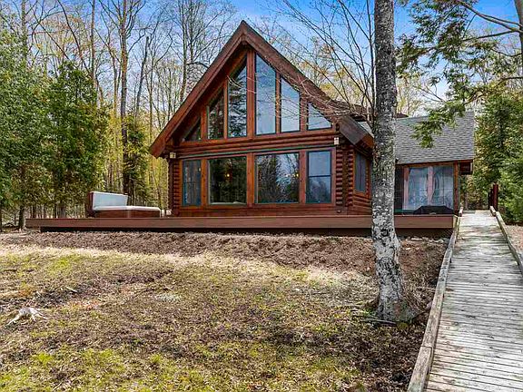 Acreage and frontage on Lake Charlevoix! 108 feet of frontage and 5 acres gives this stylish log home a warm, cozy feel. Many new updates past year includes 2 new bathrooms, a very natural composite deck across the length of the home on the waterside, hot tub, flooring, plus a gas fireplace. Above the detached 2.5 car garage is a finished bunk room that could easily be expanded upon. The home itself is in excellent condition with a complete water proofing system in the crawl space installed in 2020. Imagine a log home with no deferred maintenance!