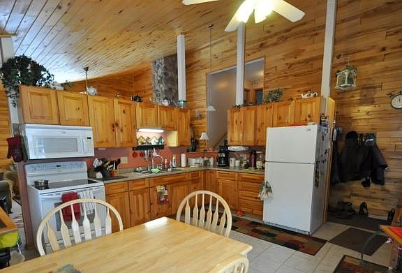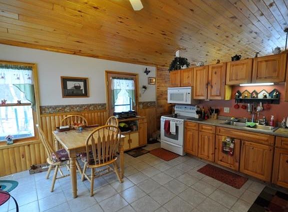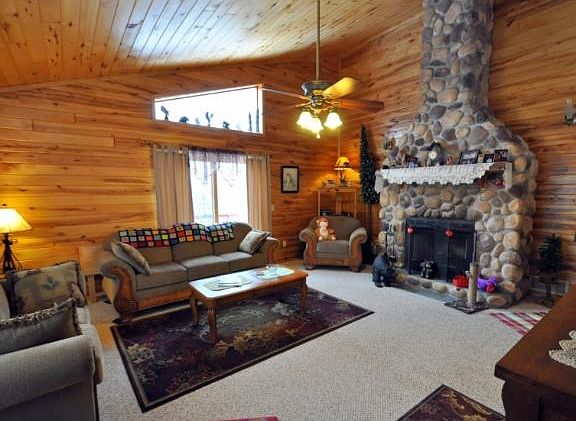 Cute up north home with 2 Bonus Cabins, gentle elevation to 243' of sand & gravel lakeshore on Eagle Lake. Privacy abounds as well as lovely gardens and westerly views. Interior boasts knotty pine with cathedral ceilings and floor to ceiling Grand Fireplace. All on 6+ acres of mature trees.