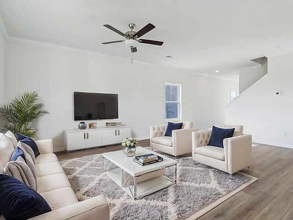 The Crestfall by Great Southern Homes is a charming two-story home featuring a classic design with modern accents. The lower floor boasts a spacious great room, dining area, and modern kitchen with elegant cabinetry, a sleek backsplash, and a double oven with gas. The upper floor includes a luxurious owner's suite with a balcony, offering a private retreat. The owner's suite bathroom features a separate tiled shower and tub, double vanities, and a huge walk-in closet. Two additional bedrooms, a loft providing family room space, and a convenient laundry room with cabinets complete the upper floor. Additional features include a wall bench organizer and a covered back patio. Verify details with the listing agent to explore personalization options.