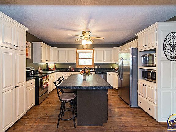 Private country retreat just 7 miles from Lawrence on blacktop. Vinland Valley 4.9 acres, hilltop setting surrounded by trees. You'll love the Large 60' x 55' shop. 3 bedrooms, 2 baths, cathedral ceiling, master bedroom loft overlooking the living area with private balcony.Floor to ceiling native stone with wood burning stove, large kitchen, open floor plan, enormous wrap around deck perfect for entertaining,all with fiber optic internet.