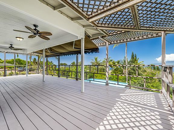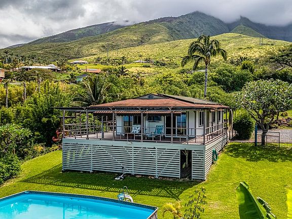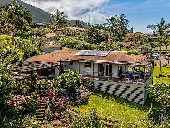 859 Kai Hele Ku is a 2 Bed / 2 Bath ohana (cottage) home located on 1 acre of land high atop Lahaina's Launiupoko, one of West Maui’s most desirable residential communities. The home is nestled among a verdant landscape featuring mature palms and tropical plants and boasts captivating Lana'i and mountain views. The bright living room and kitchen area has three sliding glass doors that open onto the covered lanai, effectively expanding the functional living space. The renovated kitchen features granite countertops, stainless steel appliances, and wood cabinets. The exterior of the home has just been painted, and the decking has been resealed. The lanai is spacious enough to accommodate a dining area and several sitting areas that can be enjoyed day or night, rain or shine. A retractable awning can be withdrawn to allow more direct sunlight. From the lanai, the views dominate, while the large grassy yard below creates a refreshing sense of space. Following the lanai around to the side of the home, one finds the home’s hidden treasure: a Zen relaxation area. Its features include a pond framed by lava rocks and surrounded by clustering lady palms, a spa tub open to the sky, and a sitting pavilion nestled among the foliage at the end of the deck way. This is a perfect spot for evening cocktails or a quiet dinner set among the greenery. Trellises that cover the pathways create dappled sunshine. Finishing the spa features is an outdoor shower located at the end of a walk. The home has two bedrooms and two full bathrooms, with one full bathroom located in the hallway and accessible to guests. The bathrooms are both newly renovated with granite counters and decorative tiling. Each room of the home, including the bedrooms, features climate control to allow for personalized comfort. There is nothing like enjoying organic, fresh tropical fruit right from the tree, and 859 Kai Hele Ku has a bountiful fruit orchard with papaya, mango, banana, passion fruit, orange, tangerine, lemon, lime, avocado, fig, and coconuts! The driveway can accommodate several vehicles, and a work shed can be used for storing tools and supplies. 859 Kai Hele Ku offers the benefits of Hawaiian country life while being close to all conveniences, with Ka'anapali just minutes away. You will also have front-row seats to the gorgeous sunsets that draw so many to West Maui! This property is a Residential CPR. Note some photos reflect virtual staging of rooms, as indicated in the image notes.