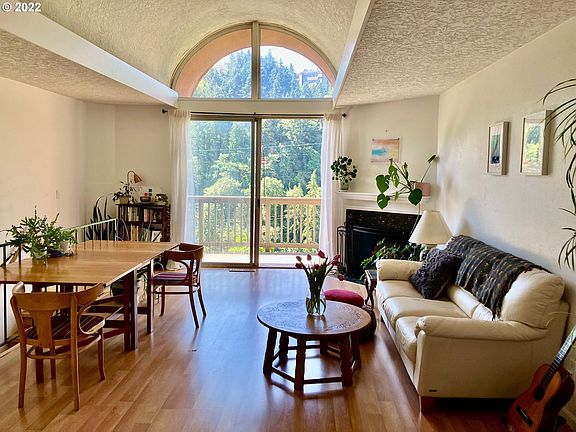 Delightful light-filled condo in townhouse-style frame expansive lush green views from soaring glass doors & windows on both floors. Open & airy rooms, cozy wood burning fireplace & two generous balconies invite the outdoors in.A stress free deeded parking space is included! Despite the secluded forested location, this gem is just minutes to downtown, OHSU, hiking trails, parks, shops, restaurants & public transportation! A unique nest indeed.