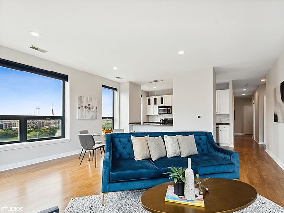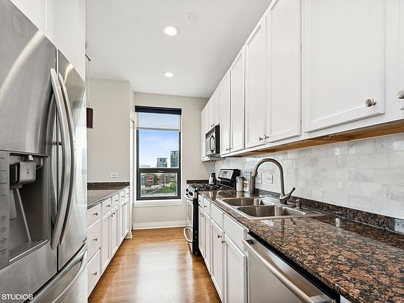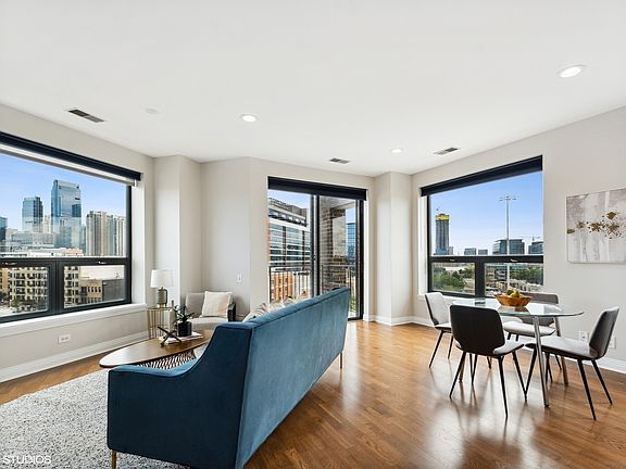 Breathtaking city & skyline views from every room of this 2Bed/2Bath corner penthouse in boutique elevator building in River West! Gorgeous, rarely available split floor plan home has new hardwood floors, chef's kitchen with white cabinets, new upgraded appliances, and new furnace. Generous sized primary ensuite complete with double vanity, glass shower, separate soaking tub, and large walk-in closet. Updated guest bath has Kohler Choreograph walls and Evervue Mirrorvue with built-in vanishing 22" LED TV. Large balcony perfect for watching sunrise or sunset complete with gas line for grilling. Additional storage included. Building amenities include stunning rooftop deck with unbeatable city views, fitness center, dog run, upgraded security cameras, and daily onsite maintenance. .2 mi Blue Line & Divy. Easy access to interstate 90/94. Blocks to West Loop & River North with dozens of shops, health & beauty options, chic neighborhood cafes, top restaurants, wine bars, Merchandise Mart, McDonald's Corporate, Google offices, SOHO House, the list goes on! 2 Premium Heated Garage Parking $30,000.