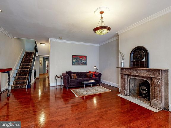 This is a MUST SEE! A unique artist re-built 1850's grand row home that has been meticulously restored with historical accuracy and updated with a modern floor plan. Exposed beam vaulted ceilings, 5 skylights, and 25 sunny windows provide an abundance of natural light highlighting gleaming hardwood floors. Multiple rooms serve as an office, library, or sitting area, in addition to 3 large bedrooms, a formal dining area, family room, and eat-in kitchen, two and a half bath. Plenty of historic details include original antique marble mantels, solid wood doors, vintage hardware, detailed crown molding, and custom ornamental iron. The location is two blocks from the University of Maryland and Biotech Park, walking distance to Inner Harbor and Pigtown Mainstreet's shopping and restaurants. Relax on the roofed back porch or upstairs balcony overlooking a private green courtyard with mature trees and views of the Ravens Stadium, Camden Yards, and B+O Railroad Museum. The Carriage House can be used as a 2-4 car garage or a large workshop. Backyard is private and secure. The facade has been newly painted and repointed, and a new central air multi zoned unit installed. There is also a huge unfinished basement that is great for storage or another workshop. This house is truly special and one of a kind. Come see!
