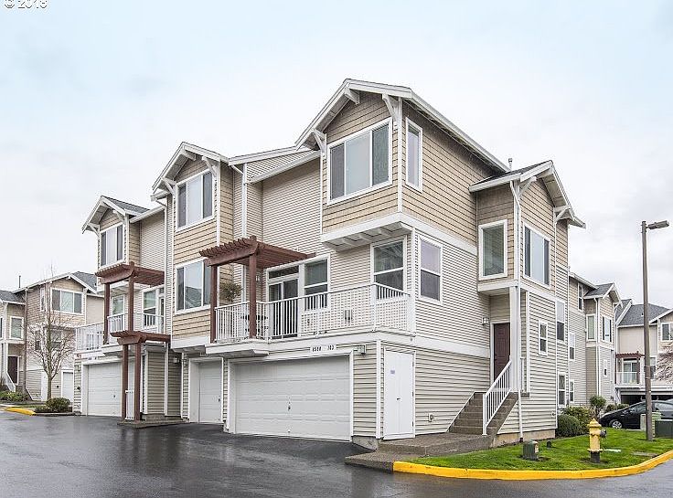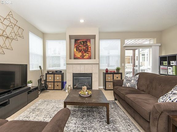 Light-filled end unit condo in Sexton Crest lives large on every level! Spacious great rm w/ balcony & gas fireplace. Modern design with solid hardwood floors throughout, brick fireplace, and blue pine live edge breakfast bar and mantle. Kitchen opens to 2nd balcony. Nice master bedroom with walk in closet, with great 2nd and 3rd rooms& 2nd bath up. One room has great views of Mount Hood. Bonus in oversized 2-car garage for storage & more. Convenient location minutes to parks, restaurants, schools, commuter routes.