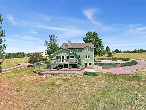 Welcome to your stunning 5-acre horse property with a private well and breathtaking mountain views! This equestrian haven features a well-appointed horse barn, complete with a separate hay room and RV parking. Inside, a great room showcases high vaulted ceilings, a charming bay window, and a cozy fireplace, creating a welcoming atmosphere. The open-concept living, dining, and kitchen areas are perfect for entertaining, with seamless flow between spaces. The kitchen is a chef’s delight, featuring an island, abundant cabinetry, a pantry, and a built-in desk area. Step outside to the serene patio, where you can enjoy panoramic breathtaking views. Retreat to the main level primary bedroom with a walk-in closet and ensuite bathroom, complete with dual vanities and a newly tiled zero-entry shower. A convenient laundry room with a utility sink and a powder bath complete this level. Upstairs, you’ll find two generously sized bedrooms and a full bathroom. The finished walk-out basement includes an additional bedroom, kitchenette, updated bathroom, and versatile open area featuring another fireplace. Outside, enjoy low-maintenance Xeriscape landscaping, a brick retaining wall, and flagstone steps and pathways. Plus, the attached three-car garage offers plenty of storage for convenience. Recent updates include new windows in the kitchen and living room, new garage doors, a new roof on both the house and barn, and fresh paint on both structures. With regular maintenance of the boiler and septic system, this home is meticulously cared for and ready for you to enjoy worry-free living for years to come. Enjoy the tranquility of country living while being conveniently close to Legend High School, Park Meadows Shopping Center, and the Denver Tech Center. This charming property is a slice of heaven with nature’s beauty right outside your door, ready to become your perfect home.