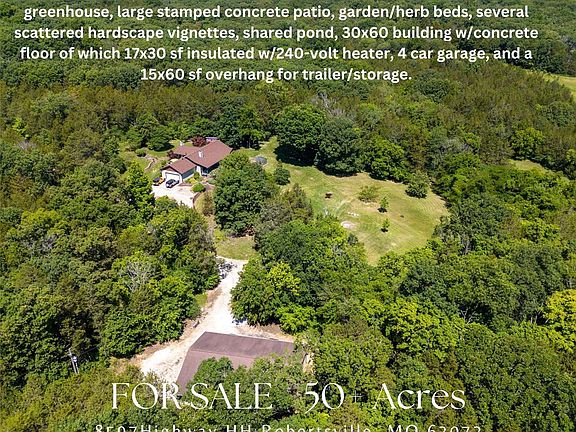 Rare opportunity for a meticulously crafted 3+ bedroom well maintained ranch home on 50+/- unrestricted acres comprised of 35+ ac of hardwood timbers, native species, and 15+ ac of pasture. Entrance from the private gated well maintained road leads to a park like setting where this estate is nestled in native Missouri flora and fauna. The gardens have been designed for ease of maintenance for year around beauty. The entire home is sheathed with plywood and has a 9 ft poured walkout basement. All windows are premium Marvin wood windows. Interior doors and trim are solid oak. High speed internet, 2022 Carrier furnace, New aerator, central vac, quartz countertops, Heatilator fireplace in living rm, wood stove in sun rm. Features: chicken coop, greenhouse, large stamped concrete patio, garden/herb beds, several scattered hardscape vignettes, shared pond, 30x60 building w/concrete floor of which 17x30 sf insulated w/240-volt heater, 4 car garage, and a 15x60 sf overhang for trailer/storage. Additional Rooms: Sun Room