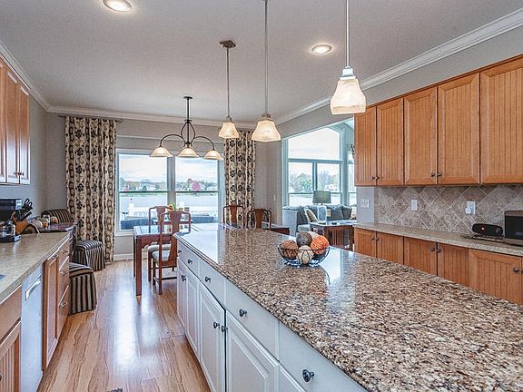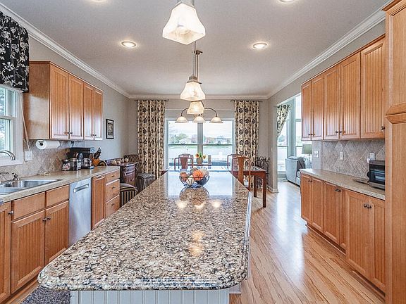 Fabulous lake front on over 1/2 acre! Private all sports Loch Erin located in the desirable Gilgal Pointe subdivision! One floor living features soaring ceilings, exceptional newer granite kitchen. Great room with stone fireplace, master suite with private deck plus office den and additional guest bedroom. Laundry, pantry, 1/2 bath and full guest bath plus attached 5 car garage! Finished lower level includes 2nd kitchen expansive family room, 2 additional bedrooms and large full bath. Patio and paved walk lead to fire pit conversational area lakeside! Generator, sprinkler system, dock and appliances included! New furnace & a/c in 2012. Loads of storage and parking!