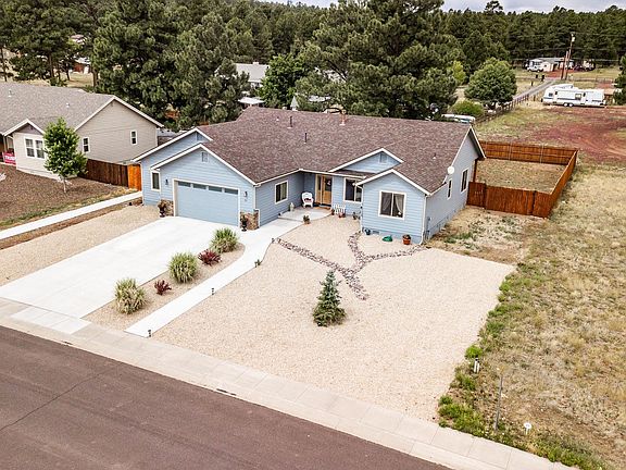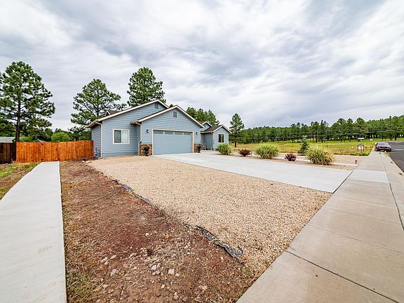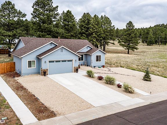 This beautiful mountain home is located just around the corner from the Elephant Rocks Golf Course and minutes from downtown Williams and historic route 66. Situated on .38 of an acre in an open meadow surrounded by dense ponderosa pine forest this home is mountain living at its finest. The split floorplan boasts vaulted ceilings, picture windows, a custom kitchen with natural cabinets, solid surface counter tops and stainless steel appliances. The large master suite with ensuite bathroom and walking closet sits at the south end of the home while an additional three bedrooms and guest bath exist at the north providing privacy. A large fenced backyard and oversized 2 car garage with an additional 8 foot bump out are the icing on the cake! Virtual tour included.