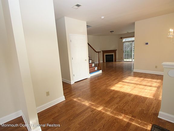 Enjoy the peace and quiet in suburbs! Elegant, spacious and bright end unit is available for rent in much after sought Woods, Holmdel. This beautiful open floor plan home offers 3 bedrooms, 2.5 bathrooms, gleaming hard wood floors, custom light fixtures and so much more. Enjoy the two story Great Room with Cathedral ceiling, cozy family room with fireplace. Sliding door opens to a tree line backyard. Luxurious Primary suite with two walk- in closets and gorgeous bathroom. Great storage space, one car garage attached. Extra guest parking spaces in front of the house. Minutes to trains, buses, Ferry, great shops, the Iconic Bell Works and the Celebrated Jersey Shore! Top rated schools. NO PETS.. Minimum one year lease. Don't miss out!